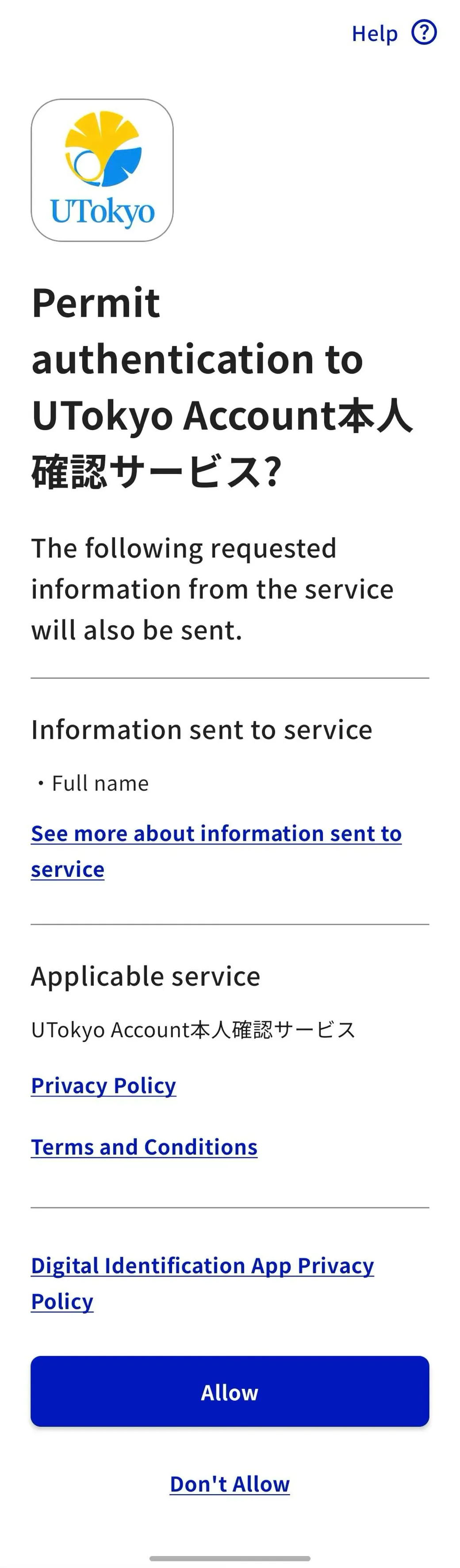 10. A screen will appear asking for permission to authenticate with the UTokyo Account Identity Verification Service. After reviewing the privacy policy and terms and conditions, tap “Allow”.