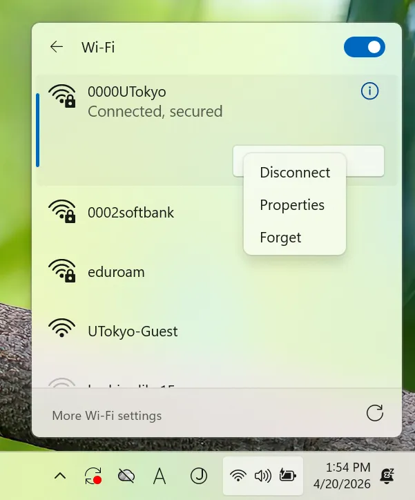 If the screen for entering a user-name and a password does not appear in Step 2 and it fails to connect to the Wi-Fi, you need to delete the existing setting and register a new one. This is necessary because although once you reissue your account and your previous account becomes invalid, your devices may still store it. Before using the new account, your devices must “forget” the previous one. There is no need to worry about never being able to connect to the UTokyo Wi-Fi again upon “deleting” a account.Right click the SSID you found in Step 2, select “Forget” from the displayed menu.