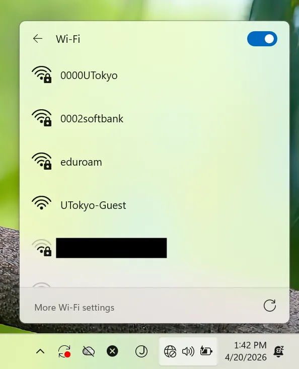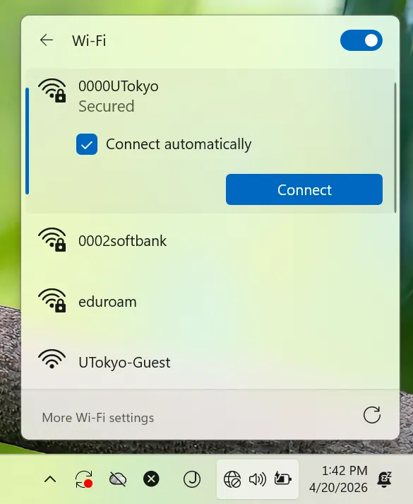UTokyo Wi-Fi is a Wi-Fi service available to members of the University of Tokyo for educational and research purposes. Please refer to UTokyo Wi-Fi page first, which summarizes the general instructions for using the UTokyo Wi-Fi. If you still need the detailed instructions for terminal of Windows, please refer to this page.