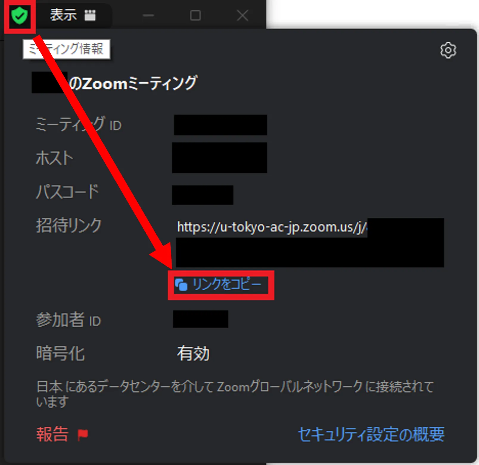 1. ミーティングが開始されたら,ミーティング画面の「参加者」の横の「^」を押して,「招待リンクをコピー」するか,ミーティング画面上部の緑色の盾マークから「リンクをコピー」して,参加者に通知してください.
