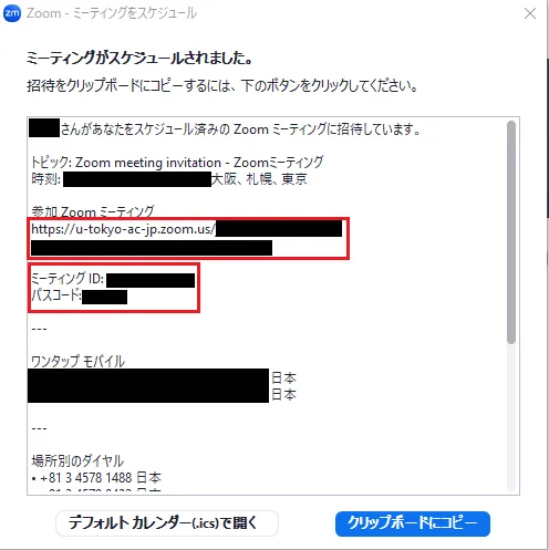 4. 右下の「保存」を押してください.ひとつ前の画面で「カレンダー」について「他のカレンダー」を選択している場合,下の画像のような画面が表示されます.「参加Zoomミーティング」の下に記載されているミーティングの URL やミーティングID,パスコードなどを抜き出して,メールなどを用いて参加者に通知してください.